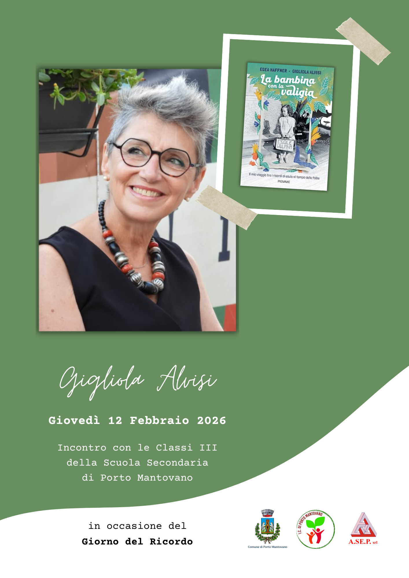 Per celebrare il Giorno del Ricordo, nell'ambito del Piano Diritto allo Studio 2025/2026, giovedì 12 febbraio 2026, la scrittrice Gigliola Alvisi incontra gli studenti delle classi 3^ della scuola secondaria di primo grado Monteverdi. In allegato la locandina dell'evento.