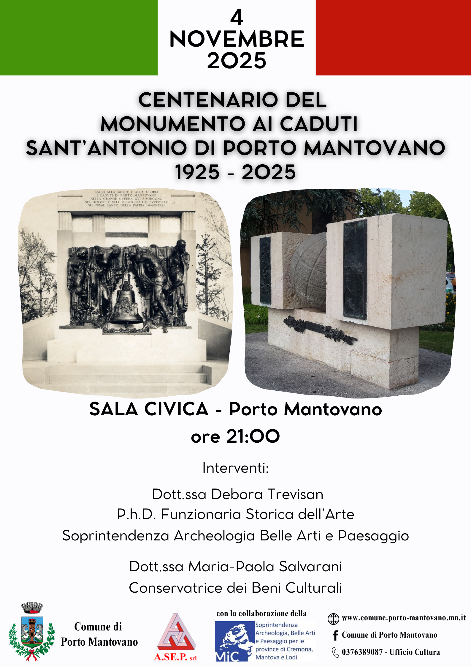 La serata tratterà dello storico monumento che venne inaugurato nel 1925, progettato dallo scultore Giuseppe Menozzi (1895-1966) e collocato dove ha sede il Municipio di Porto Mantovano.